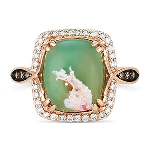 Step into the spotlight with the LeVian 14K Rose Gold Plated .925 Sterling Silver Cushion Shaped Green Aquaprase Cabochon, White Topaz, Smoky Quartz Halo Statement Ring. Crafted with genuine 14K Strawberry Gold plated 92.5% sterling silver, this exquisite ring boasts an elongated cushion shaped Aquaprase Candy cabochon, surrounded by a sparkling halo of clear Vanilla Topaz gems. Prepare to be mesmerized by the unique beauty of this newly discovered green chalcedony stone with hints of blue, green, pink, and yellow—truly one-of-a-kind.