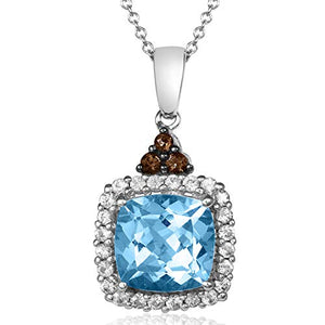 LeVian 14K White Gold, Square Cushion Cut Blue Topaz, Brown Smoky Quartz & White Sapphire Halo Pendant Necklace with Spiderweb Gallery- 18”