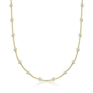 - CZ AND 18KT GOLD OVER STERLING — 5.50 ct. t.w. bezel-set CZ station necklace in 18kt yellow gold over sterling silver. Round brilliant-cut CZs. Polished finish. 20 in. long. 3/16 in. wide. 1.5mm wide cable chain. Springring clasp.