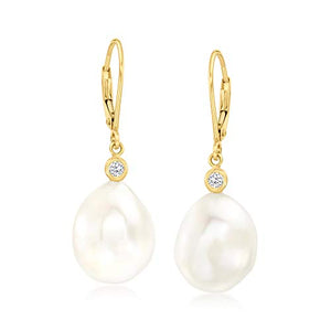 Lush 12-13mm cultured freshwater baroque pearls glow with .10 ct. t.w. round brilliant-cut diamonds in polished 14kt yellow gold. It's the perfect pair of drop earrings for every day! Hanging length is 1 3/8". Leverback, diamond and white pearl drop earrings.
