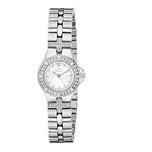 - Stainless steel case 21.5mm diameter x 10.5mm thick; Silver dial;Crystal stone accents (42 stones)
