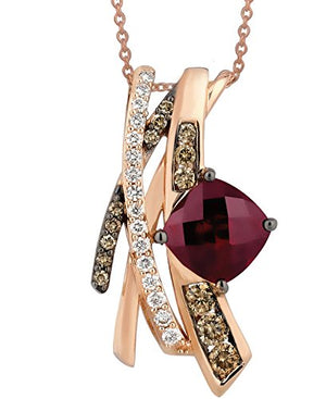 This beautiful Le Vian necklace is part of the Le Vian Chocolatier Collection. The Necklace has a center cushion cut Raspberry Rhodolite Garnet of 2.80 total carat weight with 0.60 total carats of Chocolate and Vanilla Diamonds set in 14kt Rose Gold. Color: Rose Gold.
