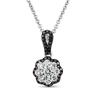 This exquisite, sophisticated flower pendant necklace is the perfect gift for yourself or a loved one. The 14K white gold pendant features a cluster of nine round cut white diamonds haloed with black diamonds. The pendant hangs from an upside down tear drop shaped bail with the same white and black diamond motif. The pendant hangs on an 18” cable chain with a lobster claw clasp. This fashionable pendant necklace will be her new favorite way to complement her formal wear or dress up her everyday ensemble! Grab this gorgeous two-tone pendant necklace while it’s still available. Color: 14K White Gold & Blackberry Diamonds.