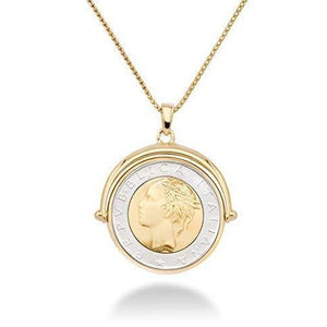 - CLASSIC STATEMENT WITH A MODERN TWIST - Inspired by a timeless notion of beauty, this Italian reversible spinner pendant features an authentic 500 Lira coin with polished round medallion frame in 18K yellow gold over sterling silver. Minted in Rome, the unique Lira no longer in circulation since the introduction of the Euro, remains the most personal and sentimental to Italians. Minimalist in design, large in impact. Stylish two-tone color is versatile to wear with both gold and silver jewelry.