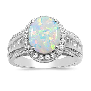 Jewelili Sterling Silver 10x8 MM Oval Created Opal with Baguette and Round Created White Sapphire Halo Ring