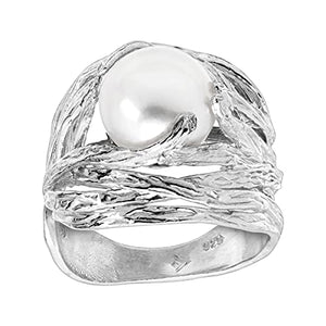 This ring is designed by artisan Efrat Saada-Limor in Israel. A round freshwater cultured pearl is held in a branch-like setting of textured sterling silver. It'll surely add a natural element to any ensemble! The piece comes with a ".925" sterling silver quality stamp as a symbol of guaranteed product quality. Pearls have been bleached to enhance their appearance. Color: White.