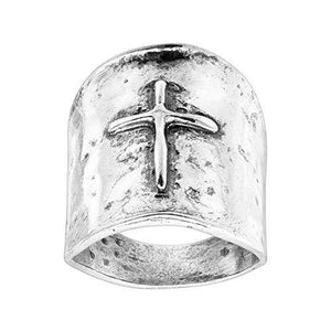 This wide Silpada 'Raised Cross' Tapered Cross Ring in Hammered Sterling Silver features a raised cross along the hammered sterling silver face, crafted in a tapered design for comfortable wearing. Ring face measures 15/16 inches in width. Piece comes with a “.925” sterling silver stamp as a symbol of guaranteed product quality.