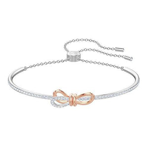 - Items delivered: 1 x Swarovski Lifelong bow bangle with white Swarovski crystals and rose-gold tone and rhodium plated mixed metal, 2 1/4 x 1 1/2 inches, with Swarovski bracelet box