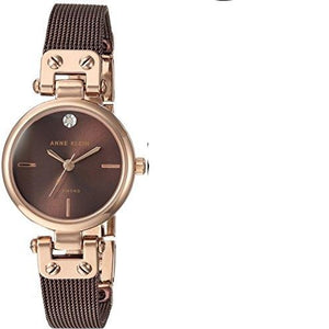Versatile, retro and fashionable style, this Anne Klein watch is comfortable to wear, with a sense of quality and timeless appeal Transition from the board room to evening drinks wearing this Anne Klein watch. Round gold-tone metal case. Gold-tone shark mesh bracelet. Jewelry clasp closure. Three-hand analog display with quartz movement. Navy blue sunray dial face features gold-tone hands, stick index hour marks at 3, 6, and 9'oclock, diamond hour marker, and brand name. Water resistance up to 3 ATM/30 meters. Presentation box included. Imported. Measurements: Case Height: 26 mm Case Width: 26 mm Case Depth: 9 mm Band Width: 11 mm Band Circumference/Length: 8 in Weight: 1.2 . Secures with a jewelry clasp closure and comes with a removable link for a customized fit. Precise Japanese quartz movement provides long-lasting, reliable timekeeping. Color: Brown/Rose Gold.