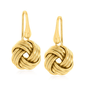 Indulge in the sophisticated charm of the 18kt Yellow Gold Plated Sterling Silver Love Knot Drop Earrings. Elevate your look with timeless elegance and style.