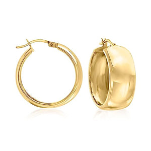 Exquisite Composition: Crafted in 18kt yellow gold over sterling silver, these wide hoop earrings boast a polished finish, ensuring a mirror-like shine that captivates attention. With a hanging length of 1 inch and a substantial width of 3/8 inches, these earrings add a touch of refined glamour to your ensemble.
