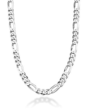 Elevate your style with the Miabella Sterling Silver 9mm Figaro Chain Necklace, a bold and masculine statement piece that exudes Italian luxury. Crafted in Italy, this chain is more than just an accessory; it's a symbol of strength, durability, and style meant to endure daily wear. Its unique flat diamond-cut beveled links create a rich look with a perfect shine, setting it apart from standard Figaro chains.