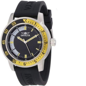 Invicta Men's Specialty 45mm Stainless Steel Quartz Watch with Black Silicone Band, Black/Yellow (Model: 12846); The unique bezel stands out over a branded rubber strap for comfortable, everyday wear. Invicta Specialty Collection Communicating time with ingenious innovation, the Invicta Specialty collection is the shining example of invention in motion. This collection captures the revelation of intuition in transcendent pieces that better depict the very nature of time. Acclaimed for unique designs, stellar movements and superior craftsmanship, Invicta Specialty inhabits the cusp of horology, where creative minds turn complications into challenges and make history one masterpiece at a time.