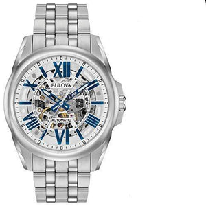 Part of the Automatics collection. Stainless steel case. Exhibition case back. Stainless steel bracelet with deployant clasp closure. Three-hand analog display with automatic, self-winding movement. See through dial with blue-tone hands and hour markers, minute track, and Bulova detailing. Water resistant 100 meters. Imported. Your Bulova watch is covered by Measurements: Case Height: 43 mm Case Width: 43 mm Case Depth: 12 mm Band Width: 21 3⁄5 mm Band Circumference/Length: 10 in Weight: 6.2 oz.