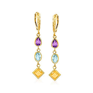 Hanging 1 7/8", these earrings drop colorful lines of pear-shaped amethyst, oval sky blue topaz, and square citrine, 6.30 ct. tot. gem. wt. Leverback, diamond-cut and polished 14kt yellow gold earrings. Each Ross-Simons item arrives in a fine jewelry presentation box. Shop Ross-Simons jewelry risk-free as all items include a 30-day, 100% money-back guarantee. Gemstone Drop Earrings.