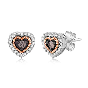 The graceful allure of these 10K Rose Gold Sterling Silver Heart Earrings, adorned with mesmerizing champagne and white diamonds, adds a touch of glamour to any outfit, making them a perfect accessory for every occasion.