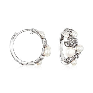 Ross-Simons 2.5-5mm Cultured Pearl Leaf Hoop Earrings With Diamond Accents in Sterling Silver