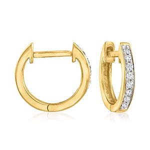 With their essential design, these slim diamond huggie hoop earrings wear well whether you’re running errands, in the office or out with the girls. Hanging length is 3/8". Hinged post, diamond huggie hoop earrings. Each Ross-Simons item arrives in a fine jewelry presentation box. Shop Ross-Simons jewelry risk-free as all items include a 30-day, 100% money-back guarantee. Color: Yellow Gold.