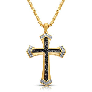 Features and Highlights of Jewelili 14k Yellow Gold Over Sterling Silver Black Rhodium Plated 1/2 Cttw Treated Black and Natural White Round Diamond Mens Cross Pendant Necklace, 22" Box Chain
