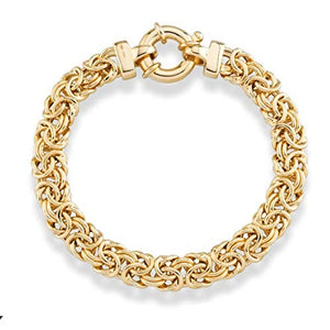 - SIGNATURE ITALIAN BYZANTINE - PURE 925 STERLING SILVER - Handcrafted of 925 sterling silver to give your jewelry a brilliant shine. Plated with a thick layer of 40 mils of 18K yellow gold for added durability. Sterling silver is hypoallergenic and nickel-free making this a great choice for individuals with very sensitive skin. Unlike cheap metals, sterling silver will not irritate your skin. Bracelet 5/16" wide (9mm). Polished and domed. Strong and secure oversized spring ring clasp closure.