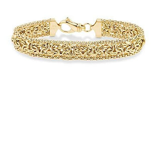 - ELEGANT ITALIAN BYZANTINE - PURE 925 STERLING SILVER - Handcrafted of 925 sterling silver to give your jewelry a brilliant shine. Finished with a thick plating of 1 micron (40 mils) of 18K yellow gold for added durability. Sterling silver is hypoallergenic and nickel-free making this a great choice for individuals with very sensitive skin. Unlike cheap metals, sterling silver will not irritate your skin. Bracelet 7/16" wide (11mm). Domed on both sides. Strong and secure pear lobster-clasp closure.