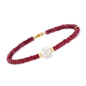 - CULTURED PEARL, RUBY AND 14KT YELLOW GOLD — 26.00 ct. t.w. beaded ruby bracelet with 9-10mm cultured pearl in 14kt yellow gold. Near-round cultured freshwater pearl. Round faceted ruby beads. Polished finish. 7.25 in. long by 1/8-3/8 in. wide. Lobster clasp.