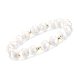 - 14KT YELLOW GOLD WITH PEARLS — 9-10mm cultured pearl stretch bracelet with 14kt yellow gold. 9-10mm cultured freshwater pearls and 3mm spacer beads. Polished finish. 7 in. long. 3/8 in. wide. Clasp-free.