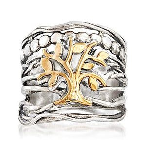 - STERLING SILVER AND 14KT YELLOW GOLD — Sterling silver and 14kt yellow gold multi-row tree of life ring. Textured and polished finishes. Sterling silver is oxidized. 3/4 in. wide. Size 8.