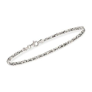 - STERLING SILVER — 2.3mm sterling silver Byzantine bracelet. Polished white rhodium finish. 7 in. long. 2.3mm wide. 5.4 grams. Lobster clasp.