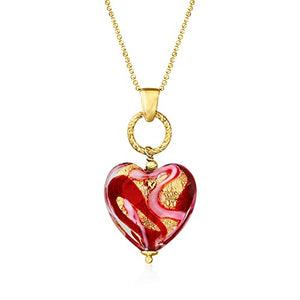 From Italy, this lovely 23x23mm Murano glass heart necklace boasts a sweet mix of red and pink coloring, with shimmering golden flecks swirling throughout.
