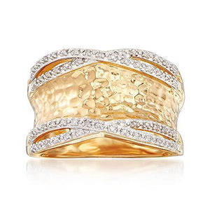 An RS exclusive. This luminous ring features crossing rows of 0.13 ct. t.w. diamonds along the edge of a polished and hammered 18kt gold over sterling silver band. 1/2" wide. 18kt yellow gold over sterling silver diamond ring. Each Ross-Simons item arrives in a fine jewelry presentation box.
