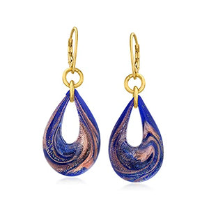 From Italy, these mesmerizing 30x20mm Murano glass open-teardrop earrings show off a glorious midnight blue hue with glittery swirls of metallic gold and rose accents.