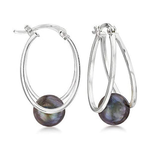 - BLACK PEARLS AND STERLING SILVER — 8-9mm black cultured pearl double-hoop earrings in sterling silver. Polished finish. 1 in. hanging length, 3/8 in. wide. Snap-bar backings.