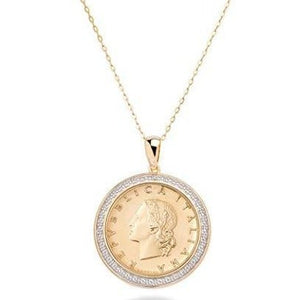 Crafted from 18K gold over silver, this 20 Lira pendant necklace with diamond accent is a reinterpreted design of classic coin jewelry. This is a genuine lira and it was legal tender in Italy before the introduction of the Euro. Characterized by its gold color, the front side of the coin features the personification of Italy as a woman's head with wheat sprigs in her hair and the reverse depicts an oak branch, symbolizing the strength and dignity of Italy. Years in circulation: 1957-1999. Made in Italy.