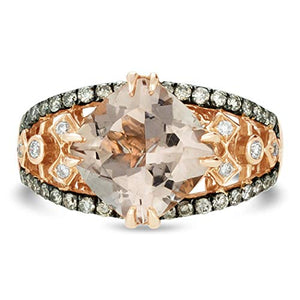 Features a kite set apricot pink cushion cut morganite centered on a flared openwork band. The edges of the band feature fancy brown diamonds while the center features floating white diamonds inside square and circle shaped settings. The ring has an open work gallery for visual interest from every angle. Color: Morganite. Make the most of the Le Vian Grand Sample Sale and grab this engagement ring now for the perfect proposal!